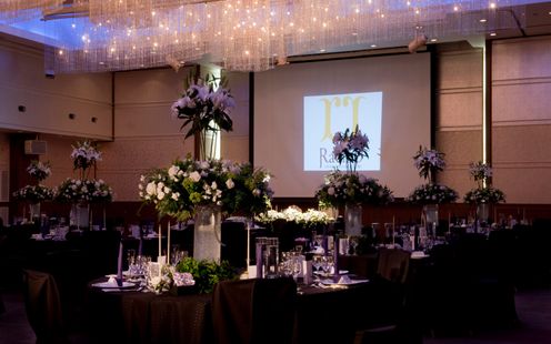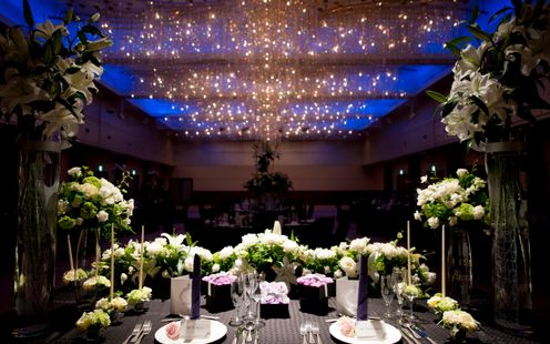高い天井に配された、銀河をイメージした五連のシャンデリアが印象的な会場です。光が重なり合う幻想的な空間は、ホテルらしいスケール感と華やかさを贅沢に味わえます。大型スクリーンを備え、映像演出やサプライズも美しく映えるしつらえ。ゲストと心地よく過ごせる上質で華やかなパーティが叶います。
