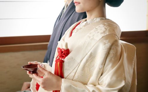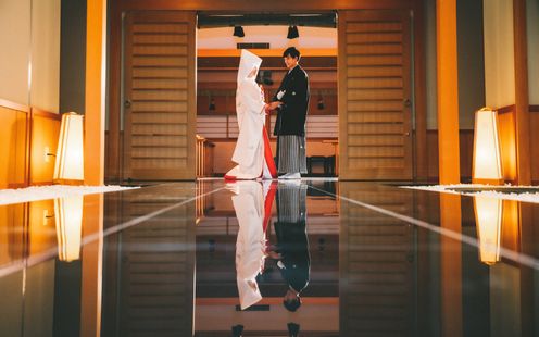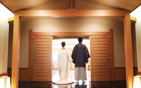 総檜造りのお社と銅板の屋根を備えた儀式殿で執り行う、古式ゆかしい神前式。黒御影石の参道を進み、雅楽の調べに包まれながら臨む儀式は、背筋が伸びるような厳かさを湛えています。華美な演出に頼らず、受け継がれてきた形式や所作そのものの美しさが際立つ、本質的な和のセレモニーが叶います。