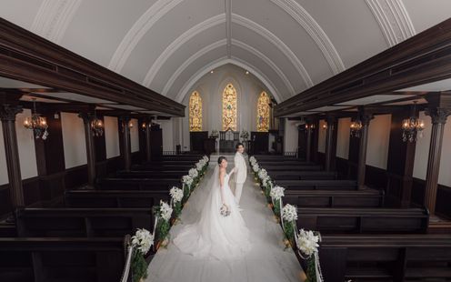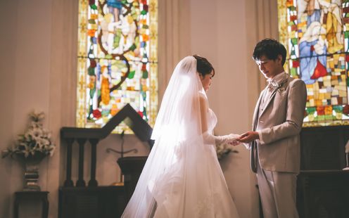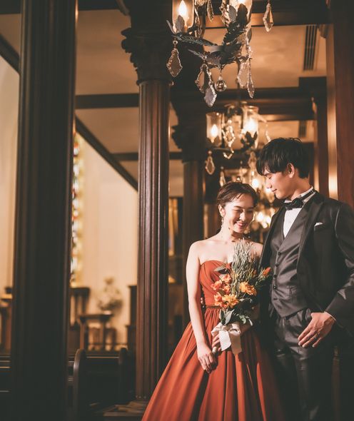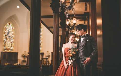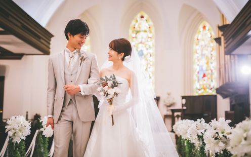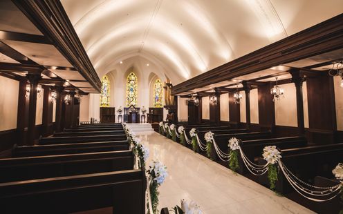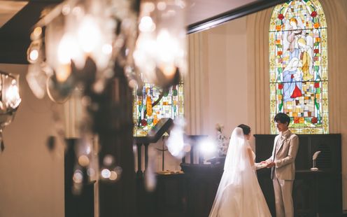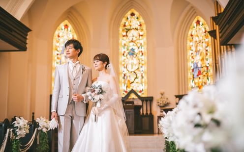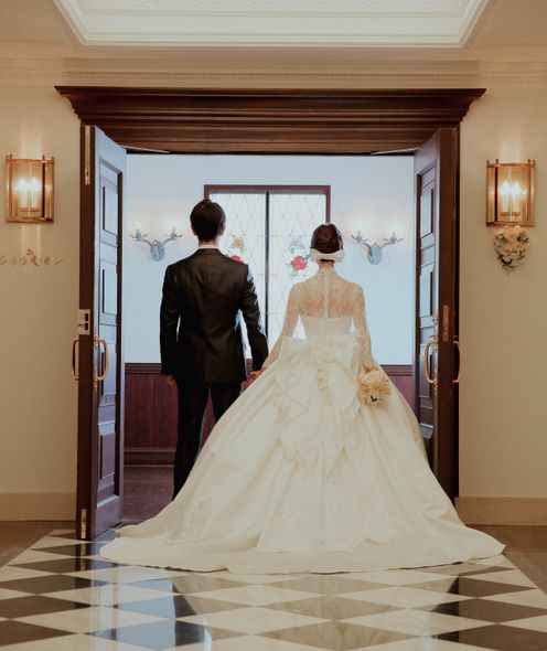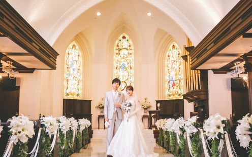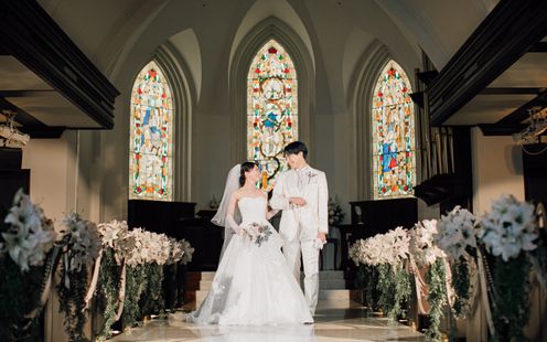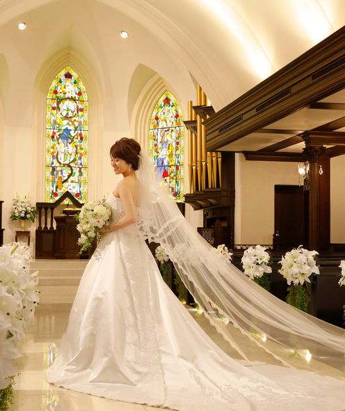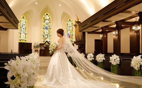 国会議事堂にも作品を残す世界的工房によるステンドグラスが天井まで配され、神聖な光が大理石のバージンロードを照らします。ヨーロッパ製のパイプオルガンと聖歌隊の澄んだ音色に包まれながら歩む時間は、どこを切り取っても美しい絵になる世界観。凛とした佇まいと深い余韻が、花嫁の心に静かに寄り添います。