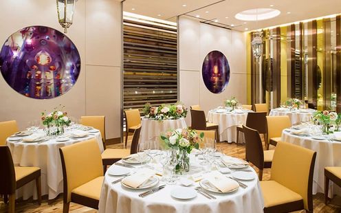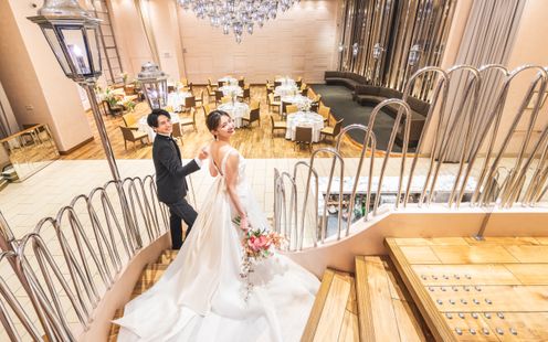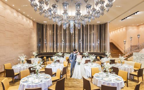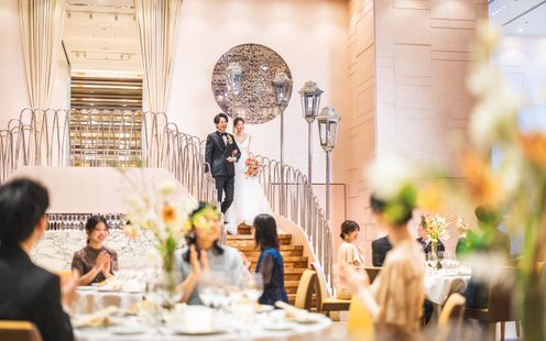 ダイニングと3つの個室で構成されている店内。天井高6mの開放感あふれるメインダイニングには、ランプをモチーフにしたオリジナルシャンデリアが上品に煌き、らせん階段が優雅な雰囲気を演出します。中心に配されたらせん階段は、新郎新婦のサプライズ入場もOK!また、後方にソファもあるのでゲストとドリンク片手にリラックスした歓談タイムをお楽しみいただけます。親族やゲストへの配慮が行き届いた空間で、美食とともにふたりらしいおもてなしを。また、カジュアルな1.5次会も可能ですので気軽にお問い合わせください。