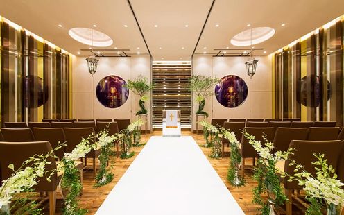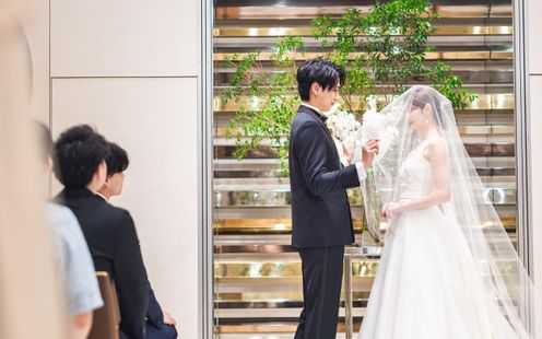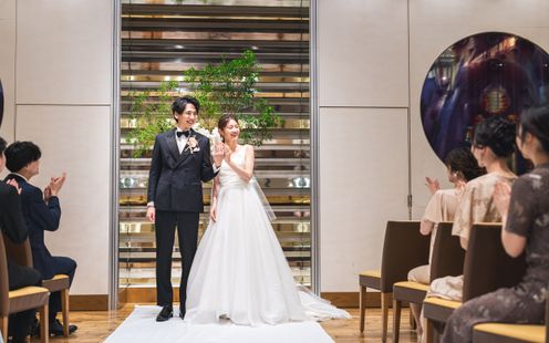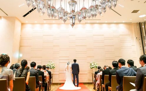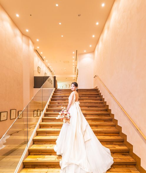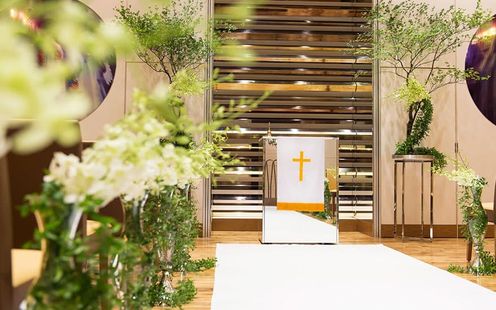 やわらかな照明が空間全体を包み込む、落ち着きと上質感あふれるチャペル。天候や時間に左右されることなく、美しいセレモニーが叶います。木のぬくもりとグリーン装花が調和し、温かみのある空間に。光の演出が一歩一歩のシーンを印象的に彩り、大切な誓いの瞬間をより深く心に刻みます。