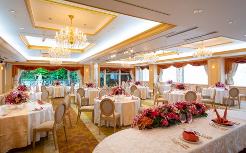 天井が高く、開放感抜群のメインバンケットで正統派の優雅なパーティを