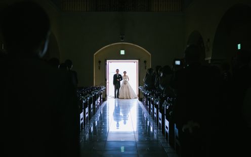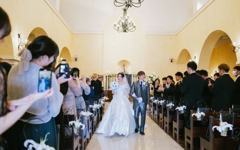 天井高15m、なだらかなアーチに映るやわらかな光。美しい讃美歌が響く中、きらめく笑顔と祝福に包まれてアットホームなセレモニーが叶います。挙式後はエリア屈指の大階段で青空のもと、盛大なフラワーシャワーやバルーンリリースをお愉しみいただけます。