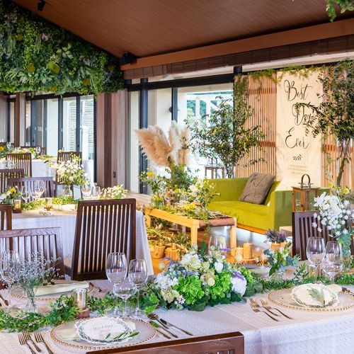 ガーデン一体型の披露宴会場なので多彩な演出が可能です。ガーデンでの石窯ピザやBBQなど、外で食べるお料理は格別でゲストからも喜ばれました。メイン席をソファにしたのでゲストとの距離も近くアットホームな雰囲気に!1日1組限定というところも魅力です。