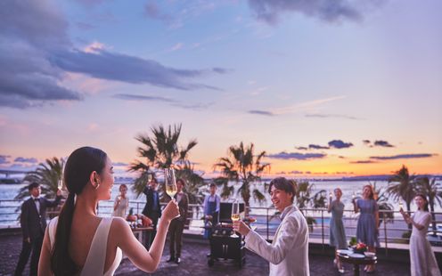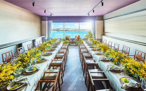 浜名湖と太平洋の絶景を臨む少人数パーティにおすすめの会場。併設されたキッチンでは、進行状況を確認しながら料理の仕上げ時間を微妙に調整し、ベストなタイミングで食事をご用意いたします。両家顔合わせを兼ねた食事会や、20~30名ぐらいの親族のみの結婚式にぴったりの広さです。パーティ後半はプールガーデンに繰り出してデザートビュッフェを囲んで和やかなひとときをお楽しみください。また、BBQパーティなどカジュアルな1.5次会も叶います。