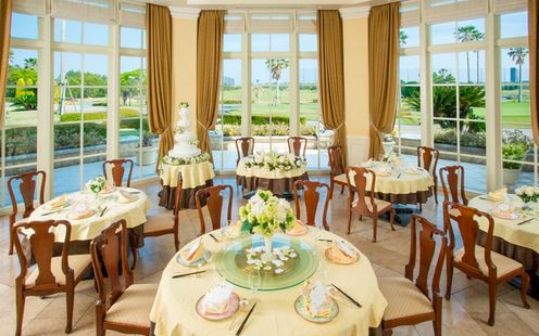 ゴルフ場のグリーンがまばゆいプールサイドではガーデンセレモニーをはじめ、フラワーシャワーやブーケトス、バルーン演出の「ドロップ&フライ}など多彩な演出をお愉しみいただけます。