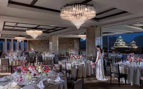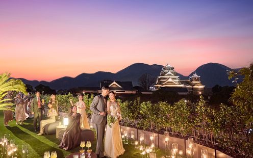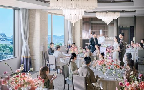ホテル最上階の披露宴会場は、おふたりの背景に熊本城が映り、熊本ホテルキャッスルならではのロケーションを堪能。