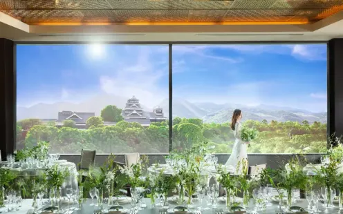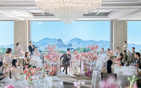 シャンデリア輝くホテルらしさと自然光あふれる開放感を併せ持つ、特別空間。ホテル最上階の披露宴会場はふたりの背景に熊本城が映り、熊本ホテルキャッスルならではのロケーションを堪能。大きな窓から降り注ぐ光はドレスをより一層美しく輝かせ、四季折々の景色もお楽しみいただけます。