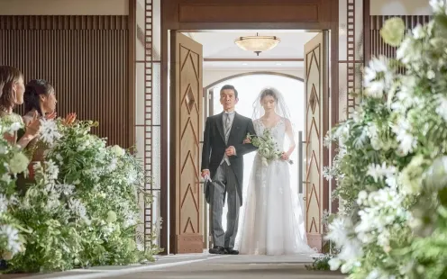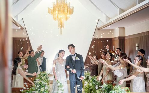 木や石など自然素材で造られた温かみあるチャペルで、たくさんの笑顔と祝福に包まれるセレモニー。思わず胸がいっぱいになる、まるで映画のワンシーンのようなひとときに。天窓から差し込む光がこれからのふたりの未来をそっと照らしていきます。挙式後は青空のもとでフラワーシャワーやバルーンリリースなどのアフターセレモニーを!