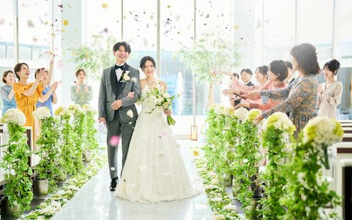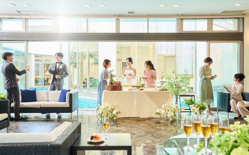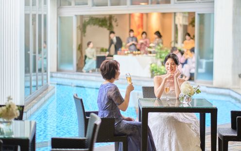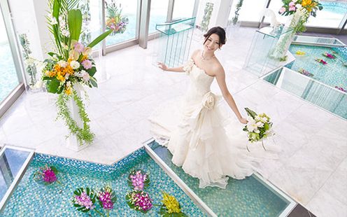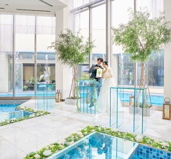 水の上に浮かぶようなガラスの空間には溢れんばかりの自然光がしっかりと注ぎ込み、幸福な未来を思わせる優しい雰囲気に。ガラス越しにおふたりを祝福する噴水や、光の空間にこだまするウェディングシンガーの生歌が、挙式をドラマティックに彩ります。光と水が調和する洗練の舞台で最高のセレモニーをお約束いたします。