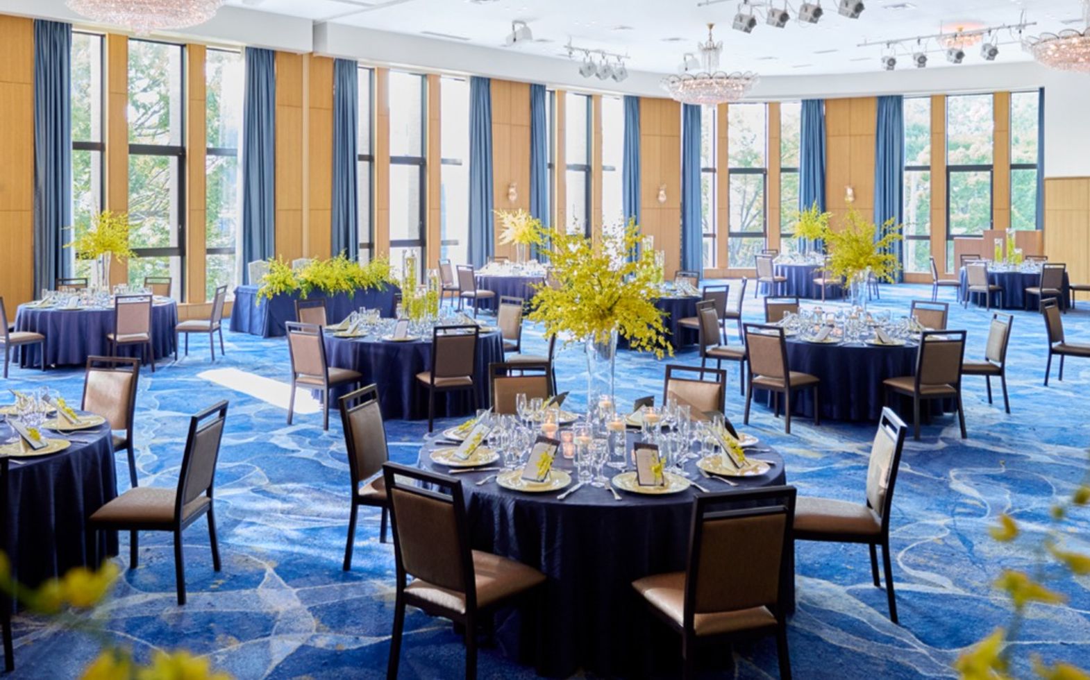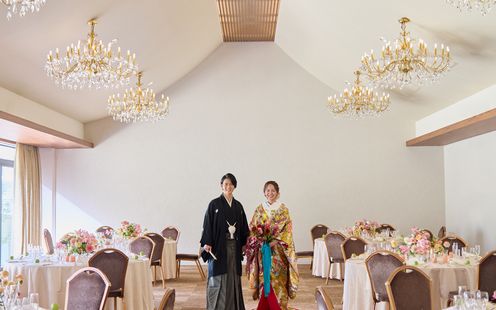 天井高5ⅿのバンケットには、クラシカルなシャンデリアが印象的で優しい光が会場を照らす。