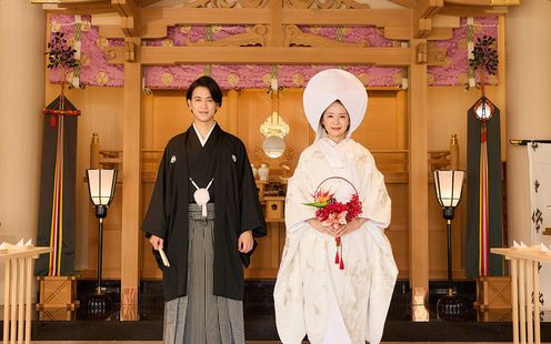大空をバックにした水に浮かぶ本格神殿もグランドオープン!石の回廊での和装記念フォトも絵になる空間です。さらに提携先である「武蔵一宮 氷川神社」で古式ゆかしい神前式も叶います。氷川参道での前撮りも可能ですので気軽にお問い合わせください。