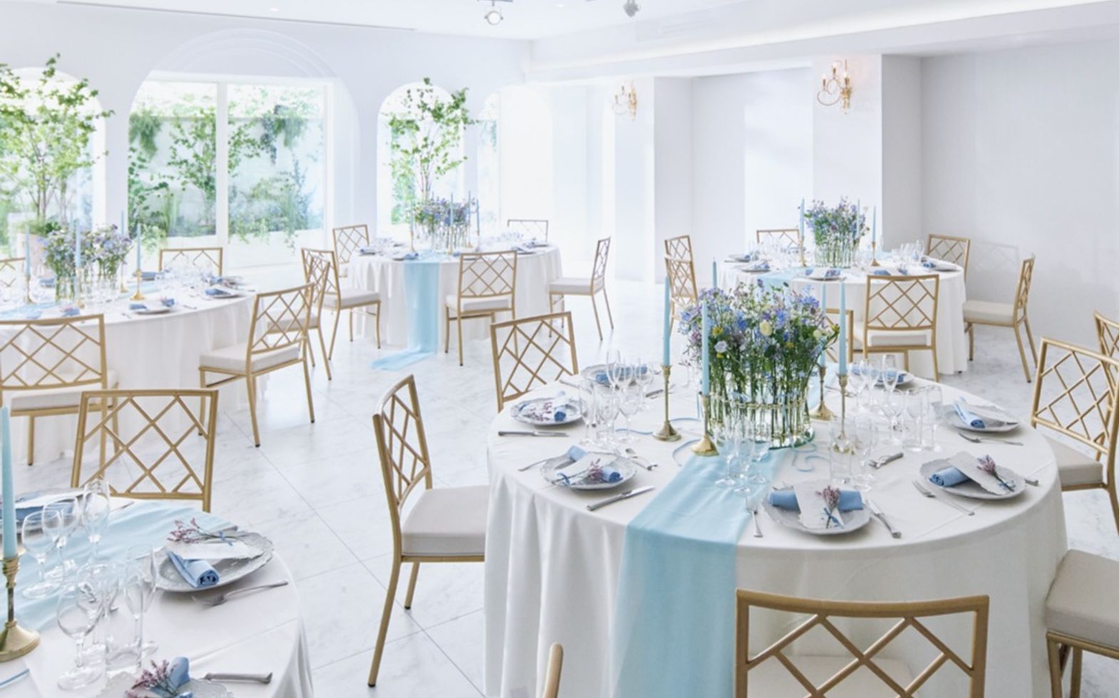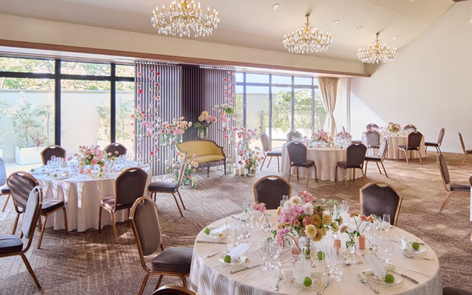 白と茶色を基調とした緑溢れる邸宅風のパーティ会場。