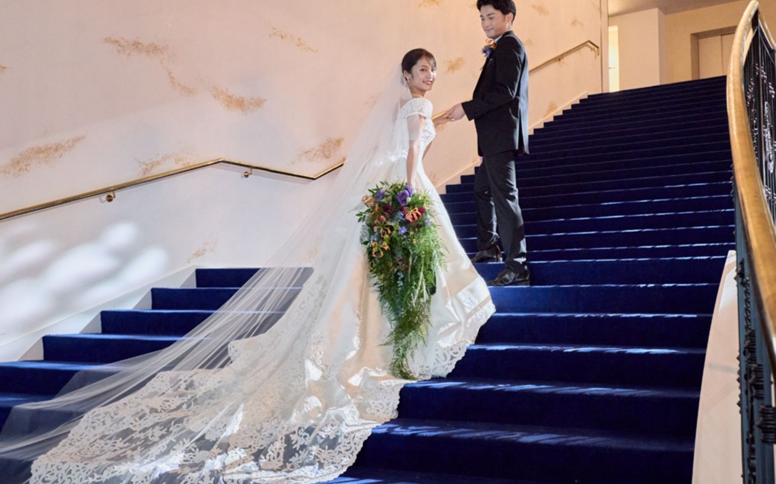 エントランスロビーを入ると正面には大階段もお目見えし、ふたりのウェディングの期待も高まるはず。
