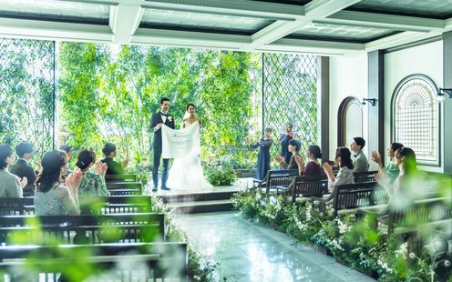 全天候型でありながらも自然光がたっぷりと差し込む『森の木漏れ日チャペル』で感動セレモニー。京都の中心地にも関わらず喧騒を忘れ、春には「桜夏には」新「緑」秋には「紅葉」へと移り変わり、優しい木漏れ日が魅力のチャペルです。新郎新婦が写真映えする空間はいつまでも色鮮やかな記録として永遠にゲストの胸に残ります。貸切だからファーストミートやファミリーミートもゆったりとした時間の中で叶います。また、リングドッグなど大切な家族の一員である愛犬も参加OKです。