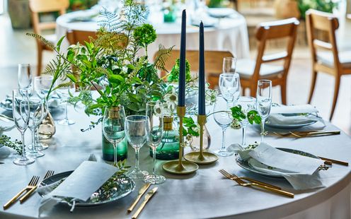 季節感あふれる花々をはじめ、トーション、クロス、席札などふたり好みのアレンジで自由自在に会場を彩ることができます。専門アーティストがふたりの希望を丁寧にヒアリングして一つひとつセンスあふれる世界観を提案いたします。