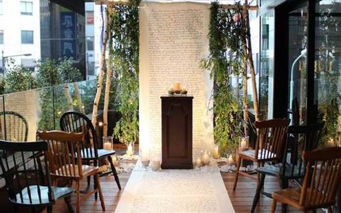 会場の奥にあるテラススペースでセレモニーが実現!爽やかな風が吹抜けるテラスではふたりらしい感謝の言葉を綴るあたたかな人前式が叶えられます。また、会場内では最大80名までの挙式も可能ですのでふたりの希望にあわせてスタイルをお選びください。