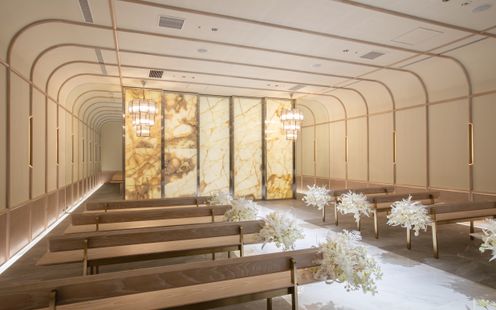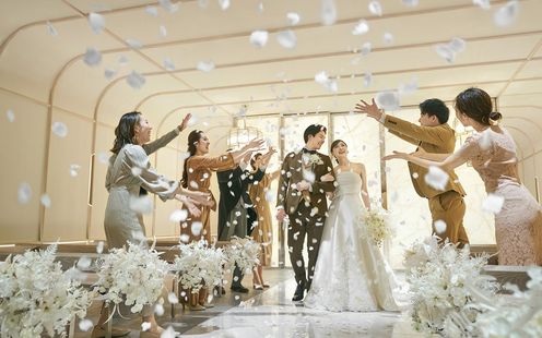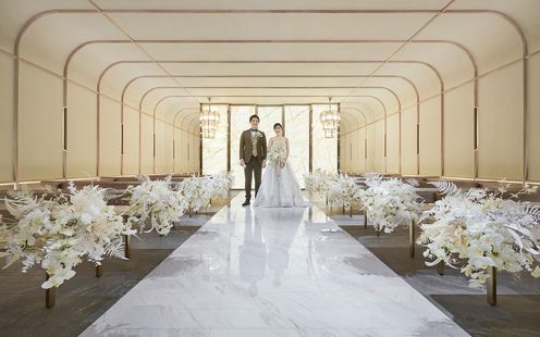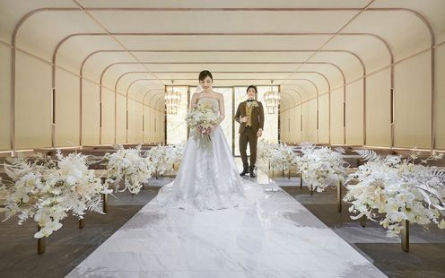 シャンデ リアの輝きが花嫁をより一層美 しく際立たせる「 COCOON (コクーン)」。ふたりのお好みのステージで挙式が叶います.