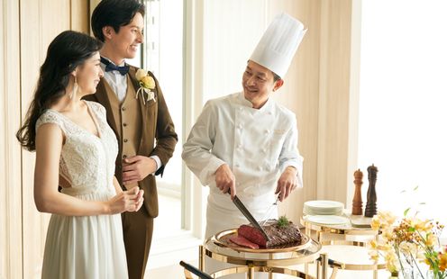 ゲストの顔ぶれにあわせて選べるので、ふたりならではのオリジナルコースをお楽しみいただけます。また、専属パティシエが世界でたったひとつおふたりだけのウエディングケーキをお作りいたします。アイシングクッキーなどの送賓アイテムや引出物もおまかせください。