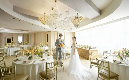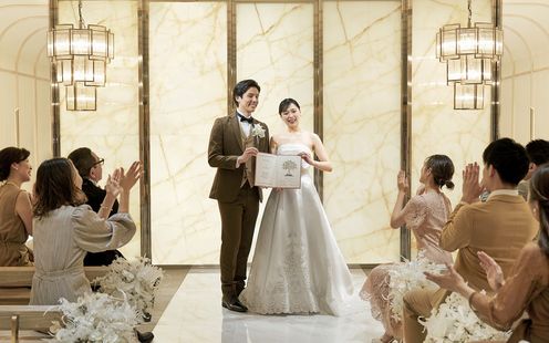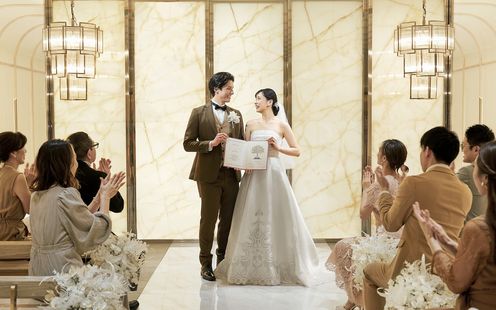 ダイヤモンドのようなキラキラ輝くシャンデリアのもとで永遠の愛の誓いを