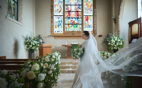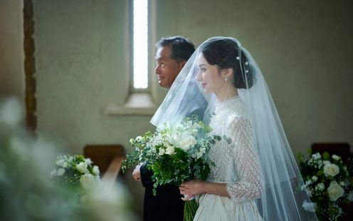 NYの聖パトリック大聖堂から移設された100年の時を刻むステンドグラスが彩る中で感動挙式