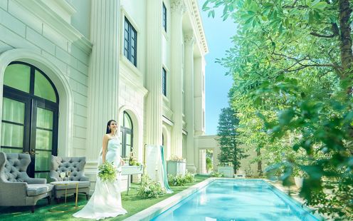 プール付きガーデンのあるパーティルーム。お姫様階段からの入場も叶う光あふれる空間