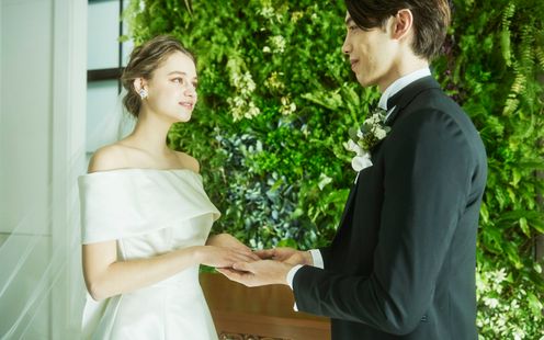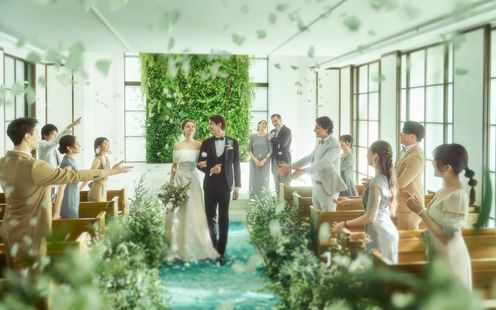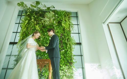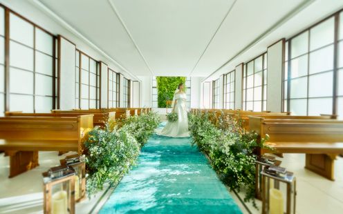 大理石のバージンロードとグリーンウォールの洗練された空間