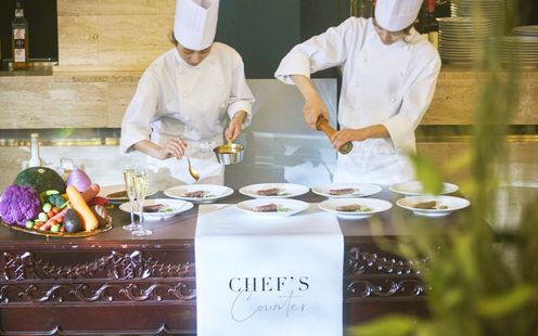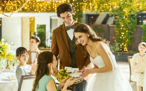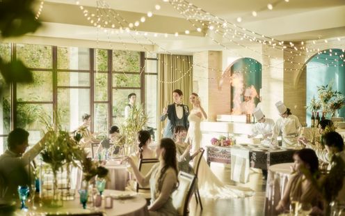 幅広い年齢層のゲストに満足いただけるように、日本人が親しみ慣れている和出汁でご用意したり、ナイフフォークではなくお箸で食べてもらう事が可能なフレンチを提供いたします。上品でありながらどこか懐かしい料理で、ゲストへ最幸のおもてなしが叶います。また、ガーデンテラスで行うビュッフェの種類も豊富な品ぞろえ。シェフがゲストに直接お肉を振る舞うグリルビュッフェや、チーズフォンデュ、お寿司バー、ひつまぶしビュッフェなどふたりの想い出の地にちなんだビュッフェメニューも対応いたします。