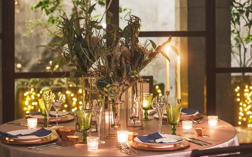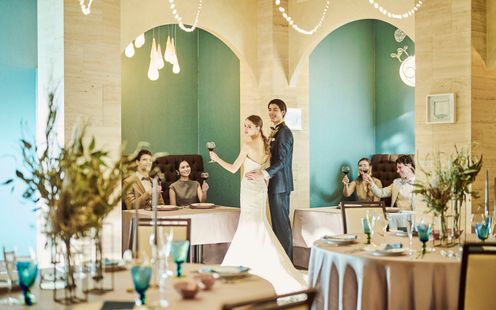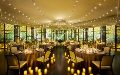 自然光の入る広々とした会場はゲストとゆったり楽しむ大人のパーティにおすすめです。会場にはミニキッチンがあり、シェフのフランベ演出などでライブ感ある美食のパフォーマンスをお楽しみいただけます。無数の光がつくり上げる幻想的な空間で、ワンランク上のお洒落なパーティが叶います。