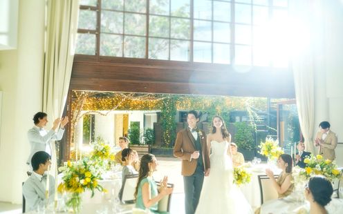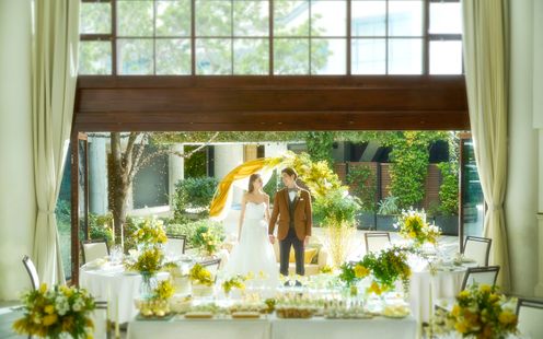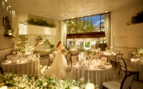 大きな窓から優しい光が差し込み、吹き抜けの天井が開放感あふれる空間を演出。また、ガーデンとひと続きなのでゲストと寛ぎに満ちた動きのあるパーティが叶うのが魅力!アフターパーティでは、ガーデンでゲストとビュッフェを囲んでプライベートな時間をたっぷりお楽しみいただけます。コーディネート次第で空間の雰囲気も一変しますのでデイタイム、ナイトタイムでお好みの色でアレンジを!
