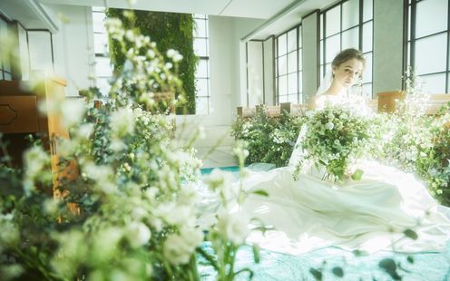 グリーンウォールのエントランスはフォトジェニックな撮影スポット。純白のウエディングドレスをまとう花嫁が際立つスペースです。