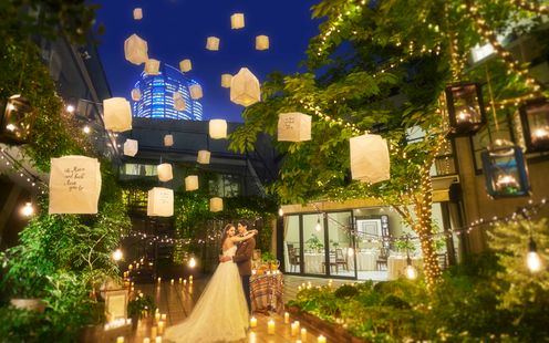 足を踏み入れるとまず目に飛び込んでくるのは、緑に包まれた開放的なガーデン。木漏れ日が心地よいガーデンパーティの魅力を存分に味わってください。挙式の後には、定番のフラワーシャワーやシャボン玉を使用したバブルシャワーなどの演出以外にも、ゲストとビュッフェを囲んでプライベートな時間をたっぷり楽しめるウェルカムパーティも可能です。また、ナイトタイムにはキャンドルやランタン演出で幻想的なひとときを。