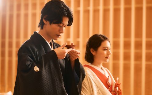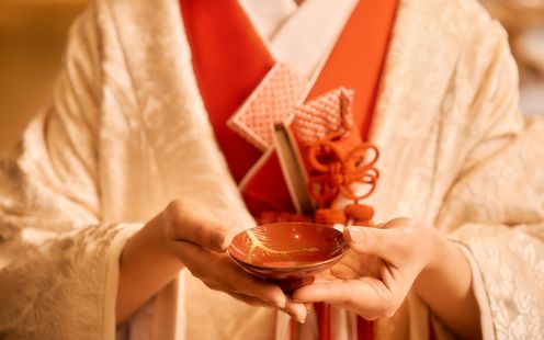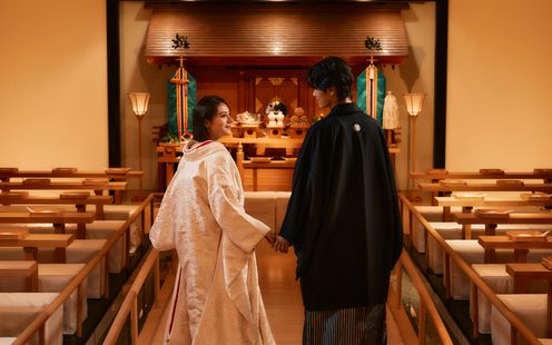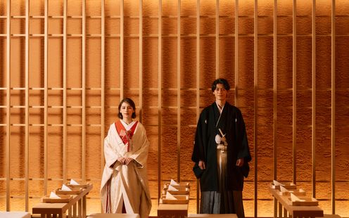 水に囲まれた神殿「水凛」は、日本の伝統美とモダンなデザインが調和した特別な空間。屋内でありながら、水のせせらぎや自然の美しさを感じられる神秘的な舞台で、心に残る和の空間。神殿ならではの、ゆるやかな曲線を描いたアーチ状の橋を囲むように、清らかな水のせせらぎが流れます。お二人の入場をより美しく輝かせる、キラキラとゆらめく光も魅力の1つです。和装が重なることで、凛とした気品と優雅さが際立ちます。