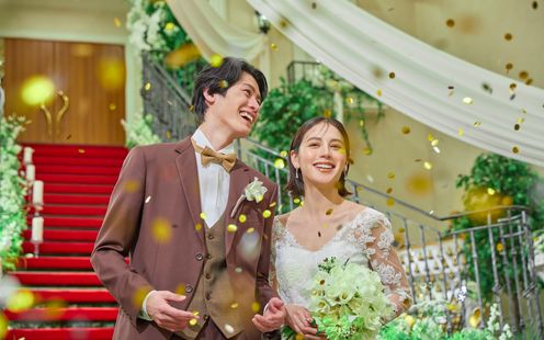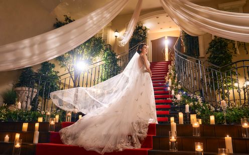 大階段に敷かれたレッドカーペットを降りる二人をゲストたちがフラワーシャワーで祝福。季節や天候に全く左右されず いつでも利用可能なのも人気の秘密。ガーデンベルの鳴り響く中、ブーケトス、ブロッコリートス、巨大クラッカー等多彩な演出でゲストと盛り上がりたい。 階段上から撮影可能なゲストたちとの集合写真もワイドに撮れて素敵な想い出に。沢山のキャンドルを散りばめてナイトウエディングのような幻想的な雰囲気も。