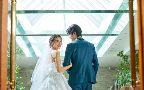 二人の大切な人を招いてゆったり過ごせる開放的な広々空間。ゲストを釘付けにするのは巨大シアターのような大迫力のパノラマ映像。プロフェッショナルなスタッフが映画のようなドラマティク映像を制作しゲストを大興奮に包みます。さらに内階段から華やかに登場し、温かな拍手と祝福を受けながら会場へ。華やかなエンターテインメントスタイルから、落ち着いた大人の雰囲気まで、ふたりの想いに合わせて自由にコーディネートできます。
