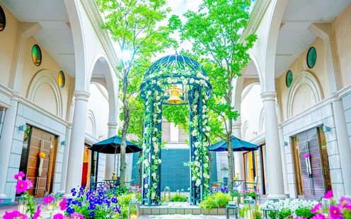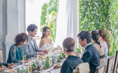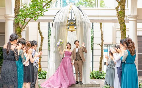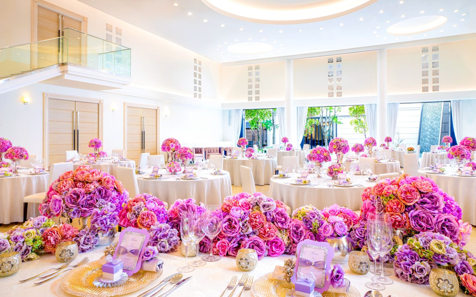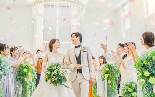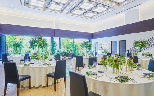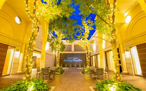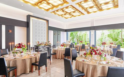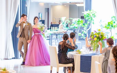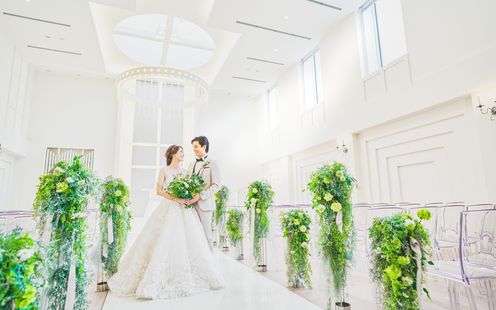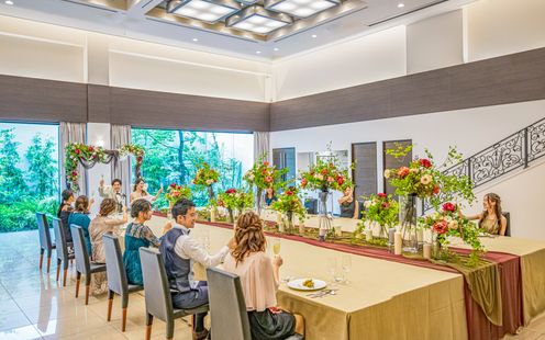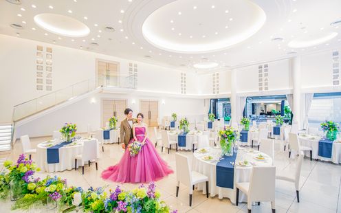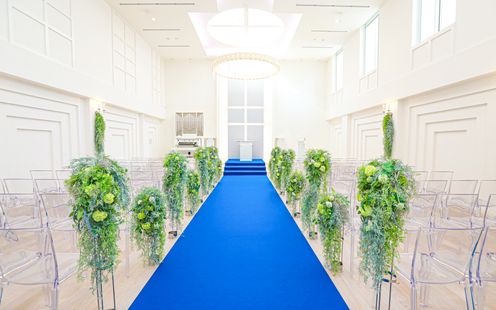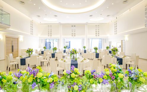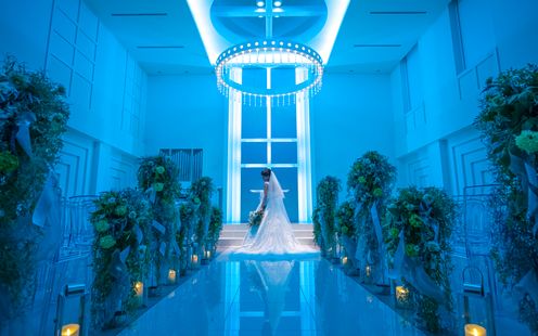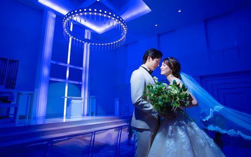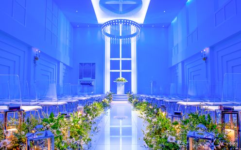 幻想的な雰囲気に包まれるブルーのライティングが印象的な白亜のチャペル『プリエールド・ランジュ』が人気。自然光の入る空間なので、花嫁のウェディングドレス姿が美しく映えます。挙式スタイルはキリスト教式/人前式/和装人前式が叶います。また、挙式後は緑豊かなガーデンでウェディングベルを鳴らし、フラワーシャワーやブーケトスをオープンエアの空間でゲストとお楽しみいただけます。ペットと一緒にリングドッグ演出なども可能ですので気軽にお問い合わせください。