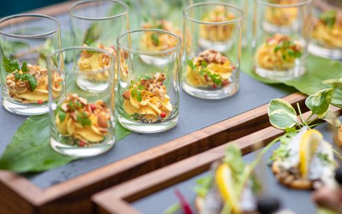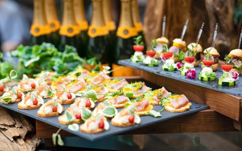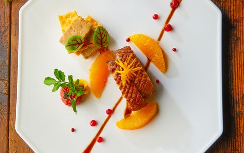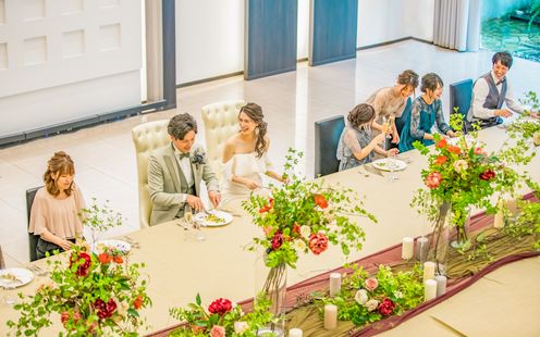フレンチの有名店で腕を磨いたシェフがチームで創り上げるフルコースは、富山の旬の食材と国内外の厳選食材を使った芸術的な逸品ばかり。料理は一品一品選べるプリフィクスメニューなのでゲストの顔ぶれを考えながらふたりらしいコースでのおもてなしが叶います。なかでも、和食とフレンチが融合したジャポネフレンチがお子様から年配のゲストまで幅広く好評いただいております。キッチンが会場に隣接しているのでパーティの進行を見ながら出来立て熱々の料理を提供しております。季節感あふれる彩り豊かな美しい盛り付けも評判なので、まずはフェアで試食を!