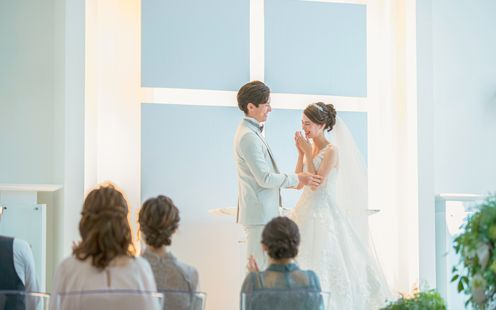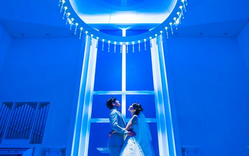 自然光の差し込む白亜のチャペル『プリエールド・ランジュ』。白と青の光が彩る感動セレモニー