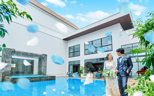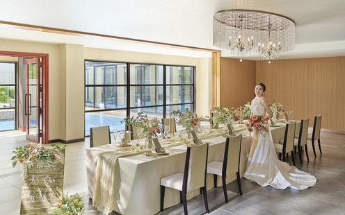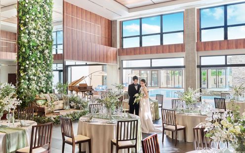 待望のリニューアルを遂げた会場は、まるで海外リゾートにいるかのような非日常感漂う空間。高い天井と壁一面のガラス窓からは自然光が降り注ぎ、輝くプール付きガーデンが広がります。大階段からの入場は、視線を集めるドラマティックなシーンとなり、一生の思い出に。木目の温もりとスタイリッシュなデザインが融合した空間では、ライブキッチンから届く出来立ての料理でもてなすことが可能。専用ラウンジや県内最大級のプライベートガーデンも自由に使え、ゲストと心ゆくまで楽しめるリゾートウエディングが実現します。
