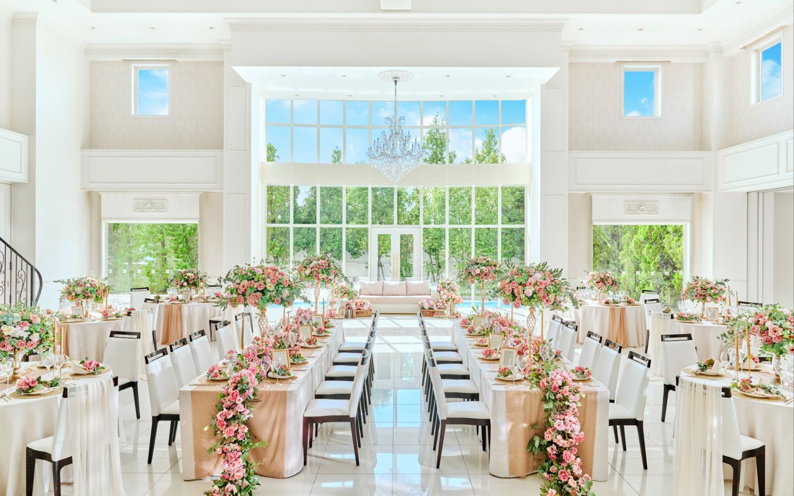 白を基調とした披露宴会場は、どんなカラーやテーマとも相性抜群。ナチュラル、エレガント、ラグジュアリーなど、おふたりの理想に合わせた多彩なコーディネートが可能です。装花やペーパーアイテム、テーブルクロスの色合いひとつで、雰囲気はがらりと変化。貸切邸宅だからこそ自由度が高く、自分たちらしい世界観を思いのままに表現できます。