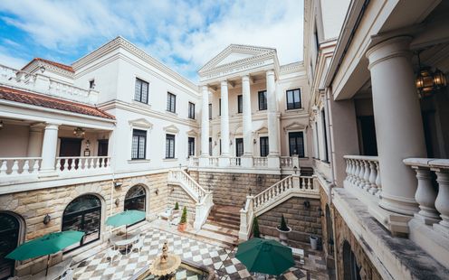 中庭を併設した、明るい自然光が差し込む寛ぎの空間。趣のある調度品とキラキラと輝くシャンデリアが、訪れたゲストを非日常の世界に誘います。