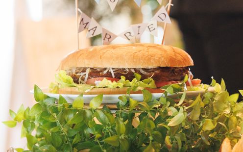 旬の食材をたっぷり使った和洋折衷のコース料理は、お箸で気軽に味わえるのがポイント。出来立てをスピーディに届けることにこだわり、四季折々の彩り豊かな一皿ひと皿がテーブルを華やかに彩ります。盛り付けも美しく、ゲストからは「SNSでシェアしたい!」という声もあがるほど。また、オリジナルのウェディングケーキや、ファーストバイトとしてふたりでかぶりつく大きなハンバーガーなどのメニューにも対応してくれます。