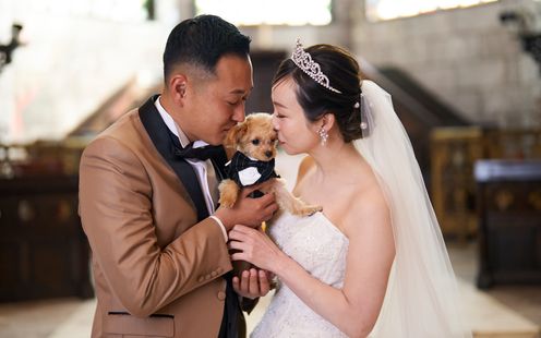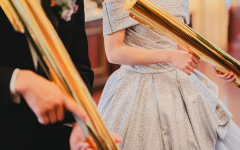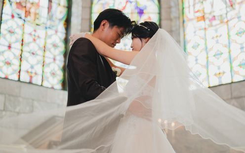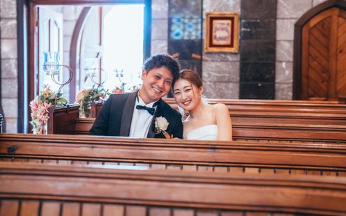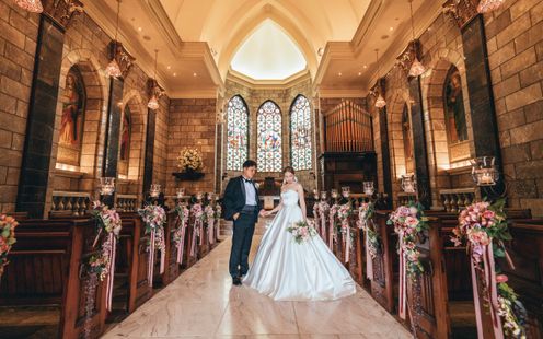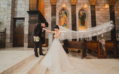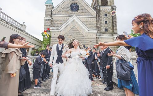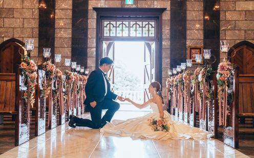 宮崎県都城の花「アイリス(アヤメ)」にちなんで名付けられた、美しく厳かな教会。ヨーロッパの教会で実際に使われていた、数百年の時を刻むステンドグラスやアンティークの調度品、天井高13mという開放感あふれる空間が特徴です。パイプオルガンや聖歌隊の音色が響き渡る中、専属の司式者の言葉に導かれ、永遠の愛を誓いましょう。フィナーレには、天井からフェザーシャワーが舞い降りる演出や、館外の中庭や回廊でのアフターセレモニー、記念撮影も一生の宝物に。また、愛犬などペット参加型や中庭での人前式も人気です。