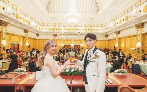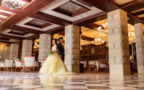 扉を開けた瞬間、まるでクラシックな宮殿を思わせる大空間が広がります。ゴールドを基調としたラグジュアリーな雰囲気と、優雅で繊細なインテリアが非日常的な世界を演出。大型スクリーンによる映像やムービングライトでの光の演出も、ゲストの心を惹きつけます。高砂からは会場全体を見渡すことができ、ゲスト全員の笑顔を感じられるひとときに。別邸専用の出入口やロビーもすべてお城のような世界観で、プリンセスになったときめきに胸が高鳴ります。