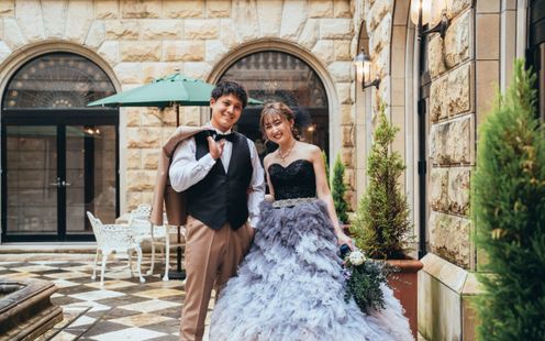 お城に囲まれた中庭は、どこを見渡しても映画の世界。中庭の噴水前で人前式を行ったり、バルーンリリースなどのアフターセレモニーをしたり、青空の下で自由な時間を過ごせます。また、披露宴中には、デザートビュッフェなどを楽しむことも可能。2階につながる大階段や回廊も、映える空間として、ふたりだけでなくゲストからも人気です。