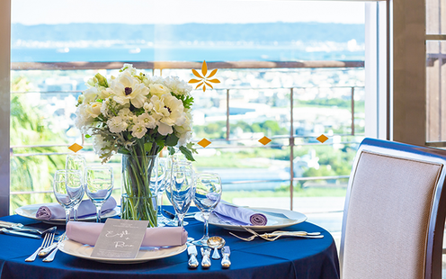 昼は陽光が射し込む開放的な雰囲気に。夜になるときらめく夜景が楽しめる優雅なパーティへ。会場から望む贅沢なロケーションが演出のひとつになるのも、アイリスならでは。時間を忘れるほどにアットホームなひとときが流れ、大切なゲストとゆっくり食事が楽しめるので、特別な演出を取り入れなくても自然と会話が弾む、そんな雰囲気が魅力です。