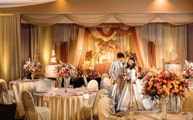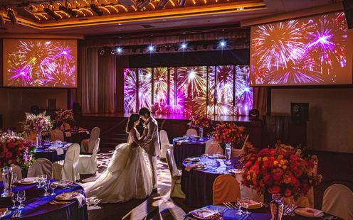 家族や友人、職場の方など多くのゲストを招待できる、450名着席可能な広々とした披露宴会場。これまでお世話になったゲストへ感謝とおもてなしを込めた、おふたりらしいプログラムを作りあげます。最新の映像演出「プロジェクションマッピング」や、会場全体をスクリーンにし音と光で織りなす迫力の演出「ムービングプロジェクター」を使ったドラマティックな演出が、おふたりのウェディングを華やかに盛り上げます。