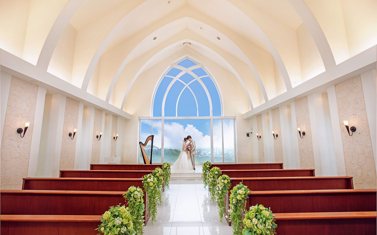 青い海を望む開放的なロケーションで誓うチャペルでの挙式。真っ白に輝くバージンロードが空の色を映し出す幻想的な空間は、訪れたゲストを魅了します。県内では珍しいハープの生演奏やパイプオルガンとシンガーによる祝福の生歌など、挙式を盛り上げる音楽演出はエリスリーナのこだわりのひとつ。こころに響く優しい旋律が挙式にさらなる感動を与えます。
