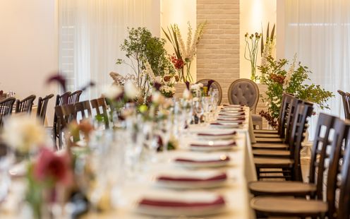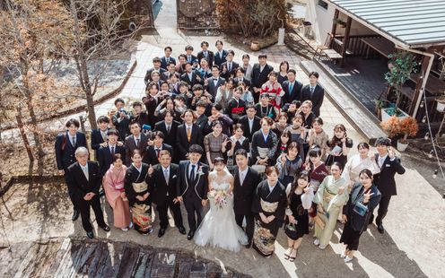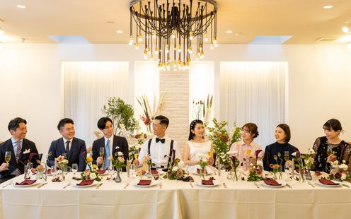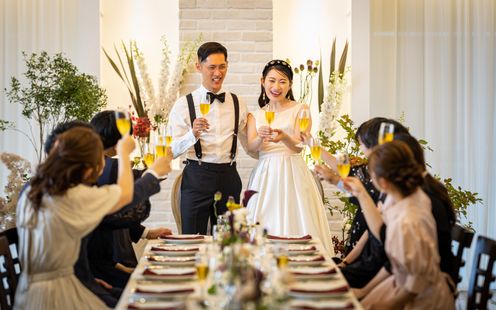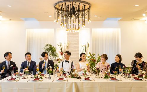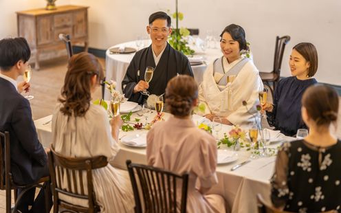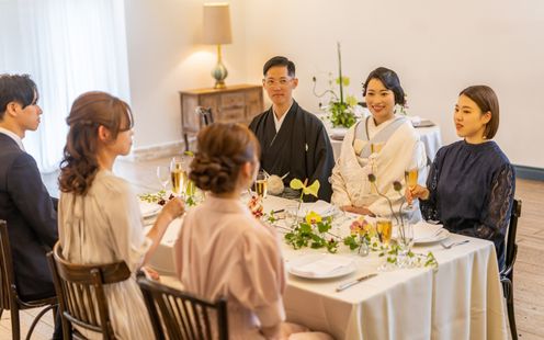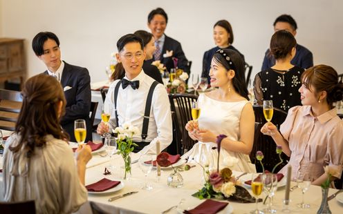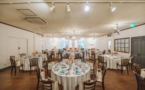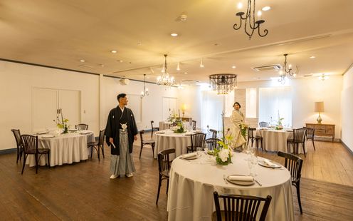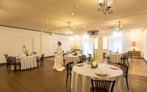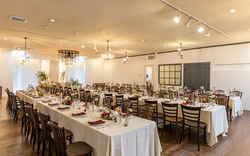 100名まで収容可能な広々としたパーティ空間は、ふたりの希望でテーブルスタイリングをはじめ、円卓や流しテーブルなどレイアウトも自在。一軒家を貸切にできるからふたりのウェディングのテーマに合わせた自由度高いパーティが叶います。家族だけの少人数パーティも可能なのでまずは気軽にご相談ください。