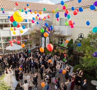 南フランスの街並みをイメージした一軒家には広々としたオープンエアの空間も!フラワーシャワーなどのアフターセレモニーをはじめ、久しぶりに会うゲストとあいさつを交わすウエルカムパーティ、そしてパーティ後半にデザートビュッフェ、記念撮影などふたりの希望にそって様々な使い方が叶います。